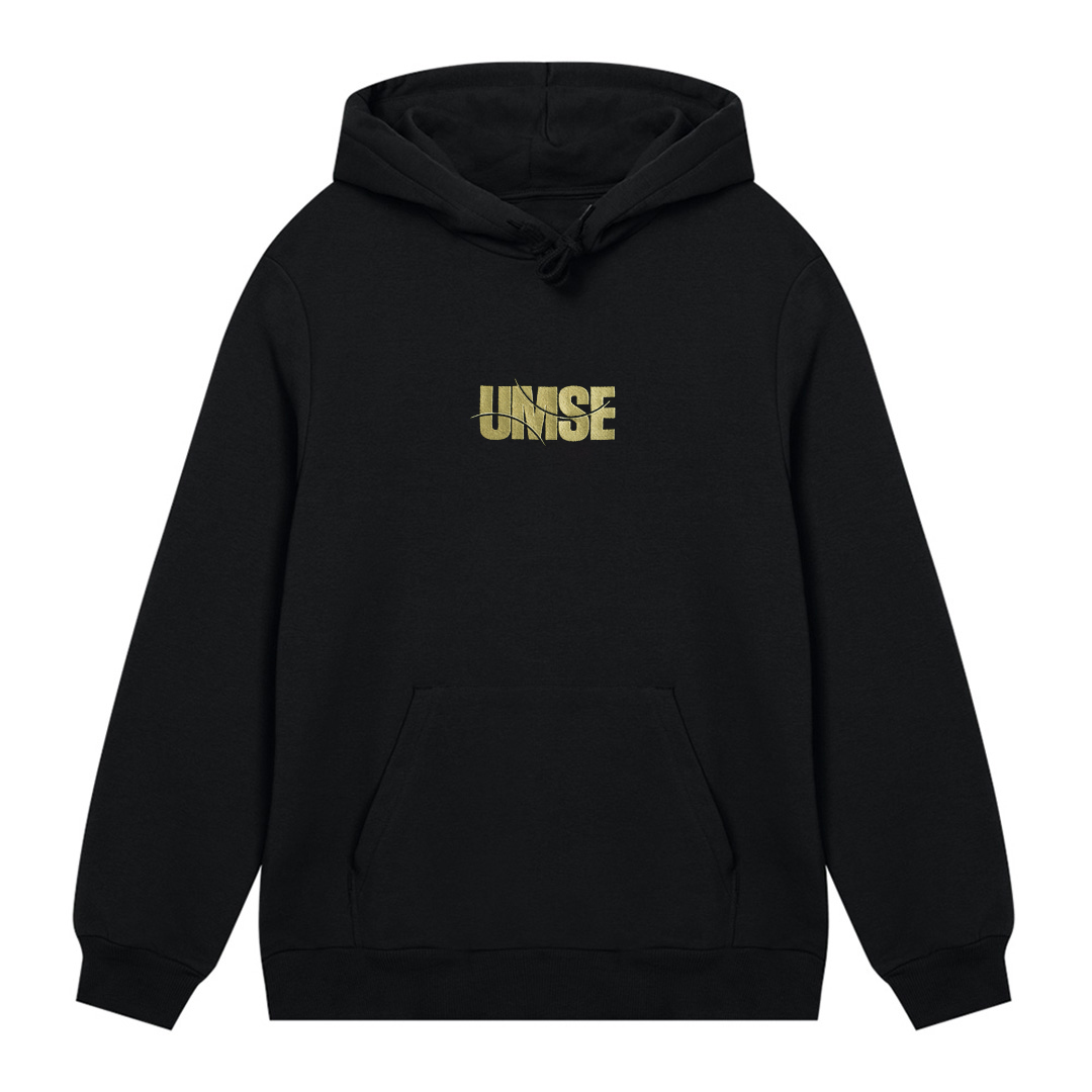 Hochwertiger, schwarzer Hoodie von Aight mit goldenem, gesticktem UMSE-Immunsystem-Logo.
